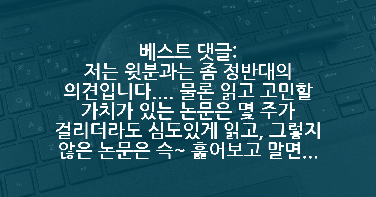 BEST저는 윗분과는 좀 정반대의 의견입니다.... 물론 읽고 고민할 가치가 있는 논문은 몇 주가 걸리더라도 심도있게 읽고, 그렇지 않은 논문은 슥~ 훑어보고 말면 되긴 합니다. 그런데 그 찰나의 순간 논문의 가치를 판단하는 실력이 과연 학부생~석사 과정에게 있을까요??