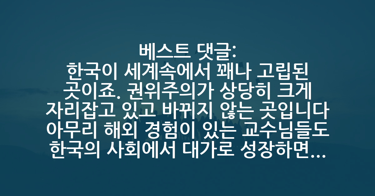 한국이 세계속에서 꽤나 고립된 곳이죠. 권위주의가 상당히 크게 자리잡고 있고 바뀌지 않는 곳입니다 아무리 해외 경험이 있는 교수님들도 한국의 사회에서 대가로 성장하면 그냥 전형적 한국인이 되어 있습니다 거기에다 한국은 한국내에서 잘하길 바라지 해외 네트워킹을 장려하는 분위기가 아닙니다. 즉 글로벌 기준과 평균 못 미치는 센스를 가진 경우가 많습니다.