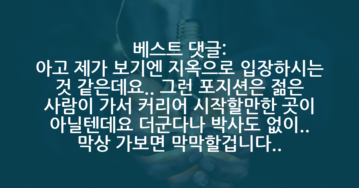 BEST아고 제가 보기엔 지옥으로 입장하시는 것 같은데요.. 그런 포지션은 젊은 사람이 가서 커리어 시작할만한 곳이 아닐텐데요 더군다나 박사도 없이.. 막상 가보면 막막할겁니다..
