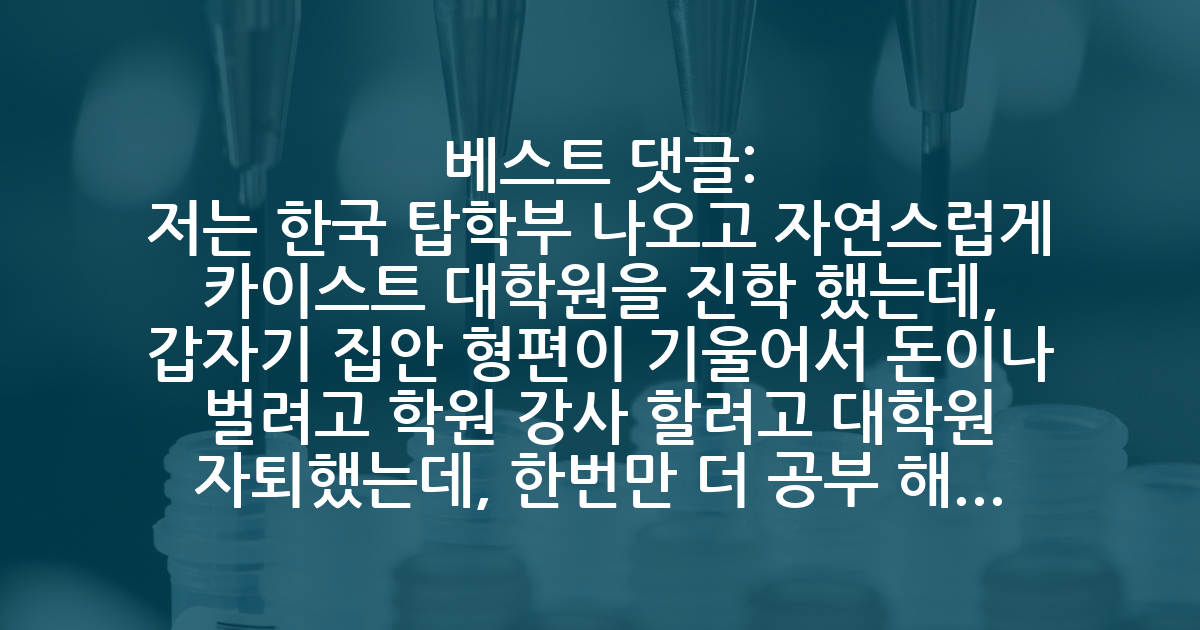 BEST저는 한국 탑학부 나오고 자연스럽게 카이스트 대학원을 진학 했는데, 갑자기 집안 형편이 기울어서 돈이나 벌려고 학원 강사 할려고 대학원 자퇴했는데, 한번만 더 공부 해보자 라는 그런 마음이 들어서, 다시 대학원에 들어갔습니다. 석사 대학원 당시 3학기 때 "스스로 나는 연구가 잘 맞구나" 라는 거를 깨닫게 되었고, 집안 형편이 어려워서, 경제적으로 취약한 국내 박사 과정은 생각도 못 했구요.