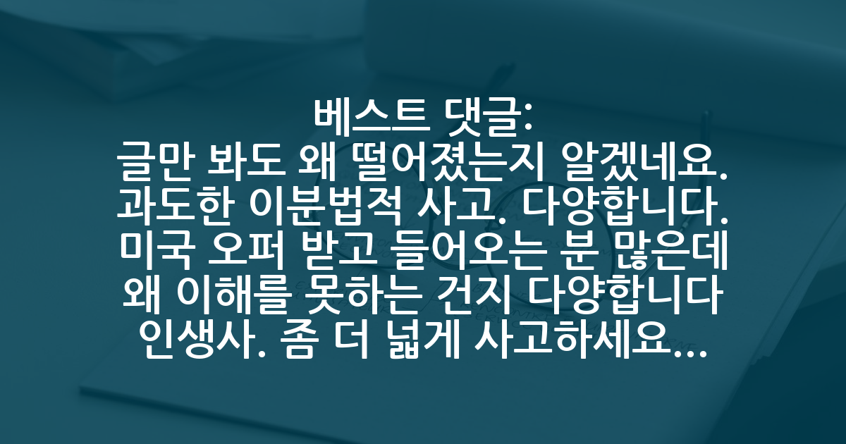 BEST글만 봐도 왜 떨어졌는지 알겠네요. 과도한 이분법적 사고. 다양합니다. 미국 오퍼 받고 들어오는 분 많은데 왜 이해를 못하는 건지 다양합니다 인생사. 좀 더 넓게 사고하세요 인식도.
