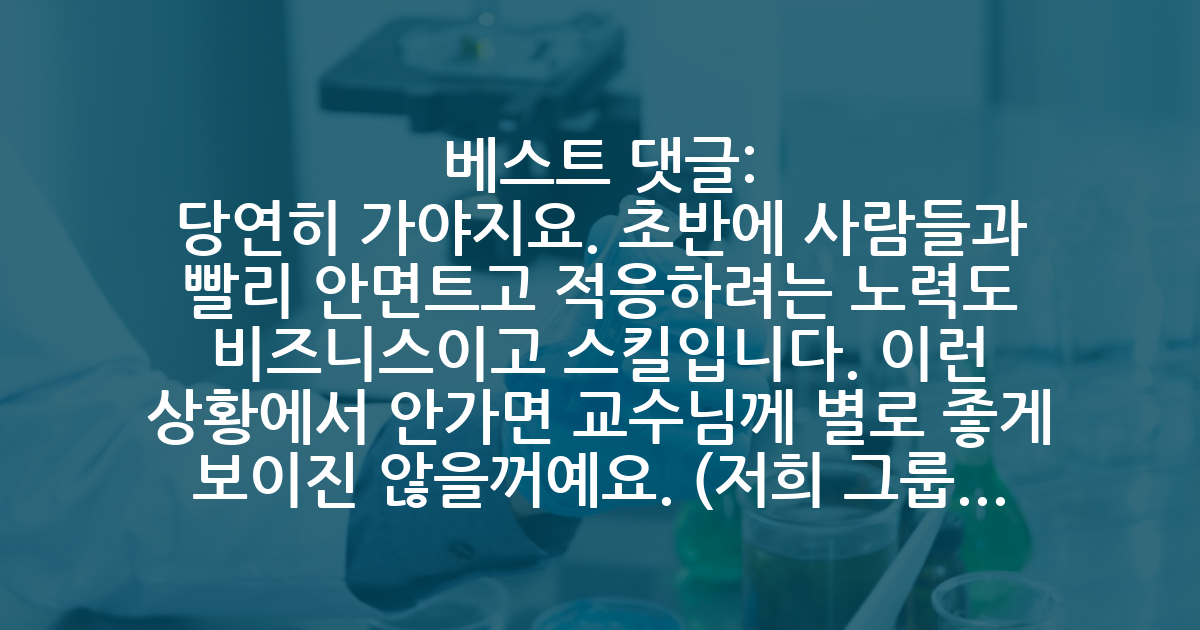 BEST당연히 가야지요. 초반에 사람들과 빨리 안면트고 적응하려는 노력도 비즈니스이고 스킬입니다. 이런 상황에서 안가면 교수님께 별로 좋게 보이진 않을꺼예요. (저희 그룹에 비슷한 케이스가 있었어서요.)