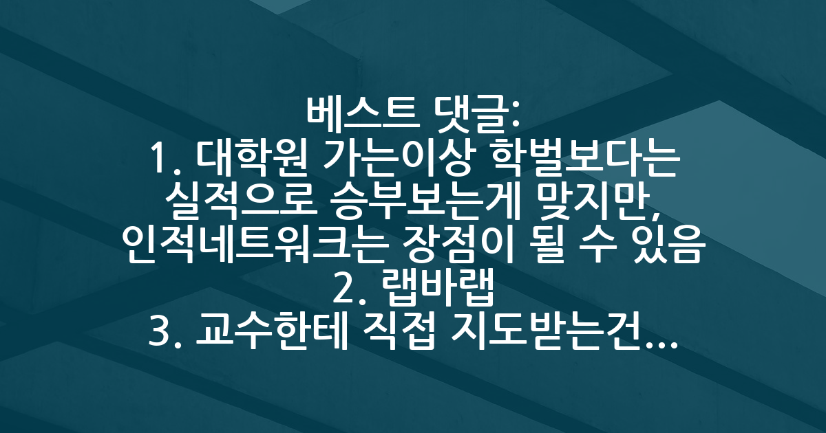 BEST1. 대학원 가는이상 학벌보다는 실적으로 승부보는게 맞지만, 인적네트워크는 장점이 될 수 있음 2. 랩바랩 3. 교수한테 직접 지도받는건 못한다고 봐야.. 대신 대가랩이면 체계가 잘 잡혀있어서 알아서 잘 돌아갈듯. 4. 뭔소린지 모르겠음. 취업이 목표면 산학장학생을 하셔야겠죠 5. 석사 정도는 해보고싶으면 해도 괜찮다고생각함. 연구해보다가 아 적성에 안맞네 -> 취업, 어 더 연구하고싶은데? -> 박사 6. 타대도 텝스 받아줘서 걍 토익할바에 SPK 한 번에 커버 할 수 있는 텝스 추천