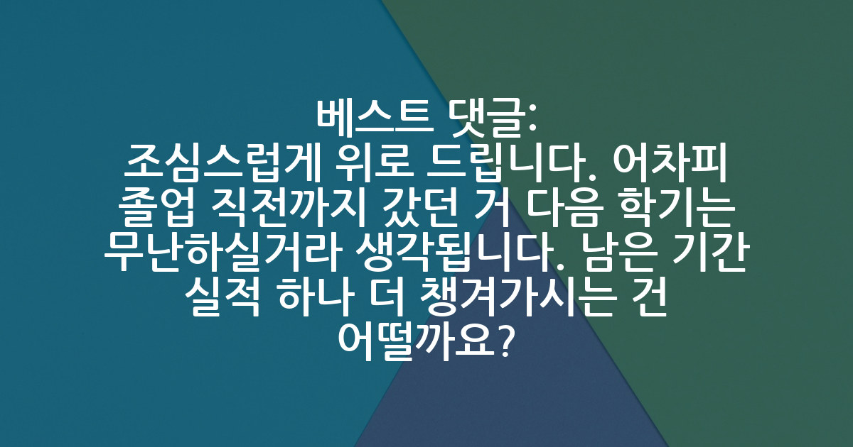 BEST조심스럽게 위로 드립니다. 어차피 졸업 직전까지 갔던 거 다음 학기는 무난하실거라 생각됩니다. 남은 기간 실적 하나 더 챙겨가시는 건 어떨까요?