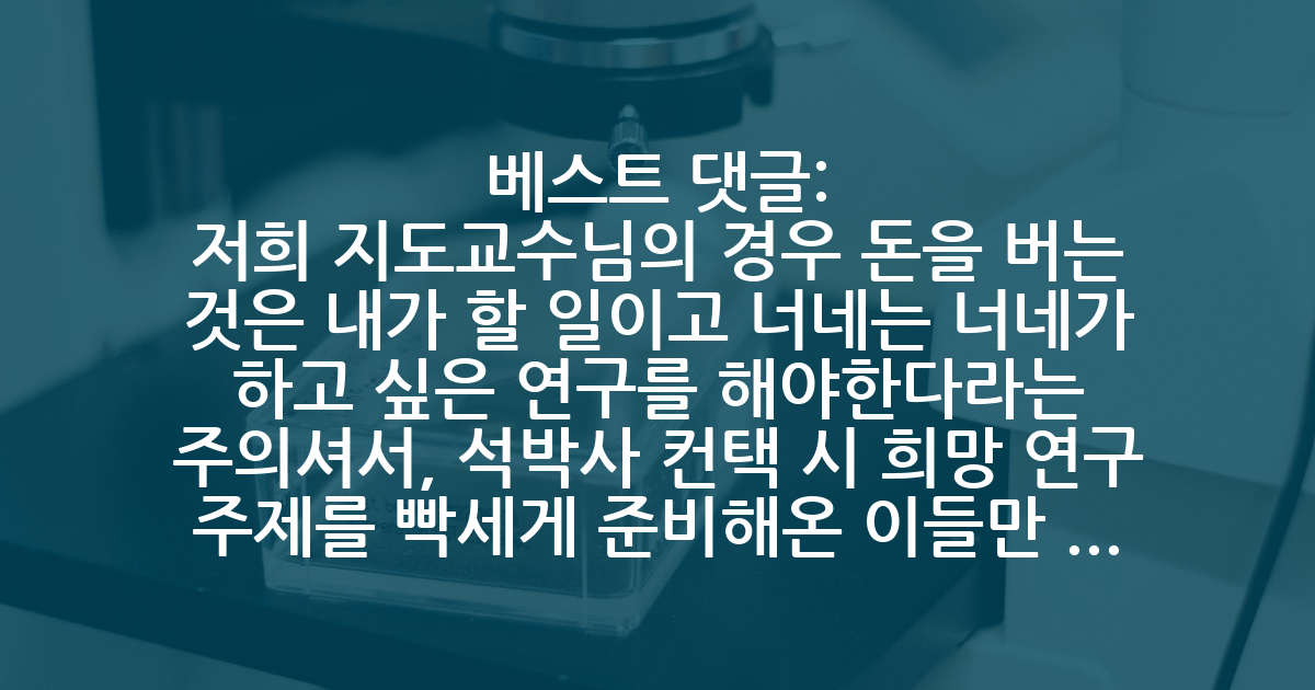 BEST저희 지도교수님의 경우 돈을 버는 것은 내가 할 일이고 너네는 너네가 하고 싶은 연구를 해야한다라는 주의셔서, 석박사 컨택 시 희망 연구 주제를 빡세게 준비해온 이들만 뽑곤 하십니다. 저희 지도교수님께서 존경할만한 분도 맞으시다고 생각은 합니다만, 그냥... 뭐 좋은 교수님도 있더라구요. 물론 주제의 자율성을 주는 대신 무조건 output을 뽑아내라는 주의셔서 중간에 탈주하는 사람도 있긴합니다.