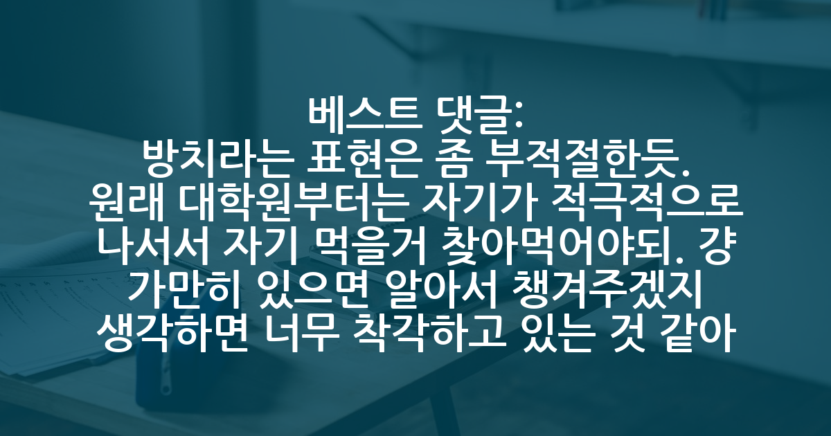 원래 대학원부터는 자기가 적극적으로 나서서 자기 먹을거 찾아먹어야되. 걍 가만히 있으면 알아서 챙겨주겠지 생각하면 너무 착각하고 있는 것 같아