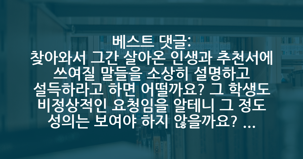 6 - 찾아와서 그간 살아온 인생과 추천서에 쓰여질 말들을 소상히 설명하고 설득하라고 하면 어떨까요? 그 학생도 비정상적인 요청임을 알테니 그 정도 성의는 보여야 하지 않을까요? 그것도 못한다면 애초에 추천서가 절실한 것도 아닐테고요.