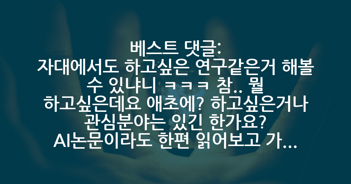 BEST자대에서도 하고싶은 연구같은거 해볼 수 있냐니 ㅋㅋㅋ 참.. 뭘 하고싶은데요 애초에? 하고싶은거나 관심분야는 있긴 한가요? AI논문이라도 한편 읽어보고 가고싶다 어쩐다 하는건가요? 걍 님같은 분들은 대학원 안가시는게 시간 안버리고 좋을거 같은데..