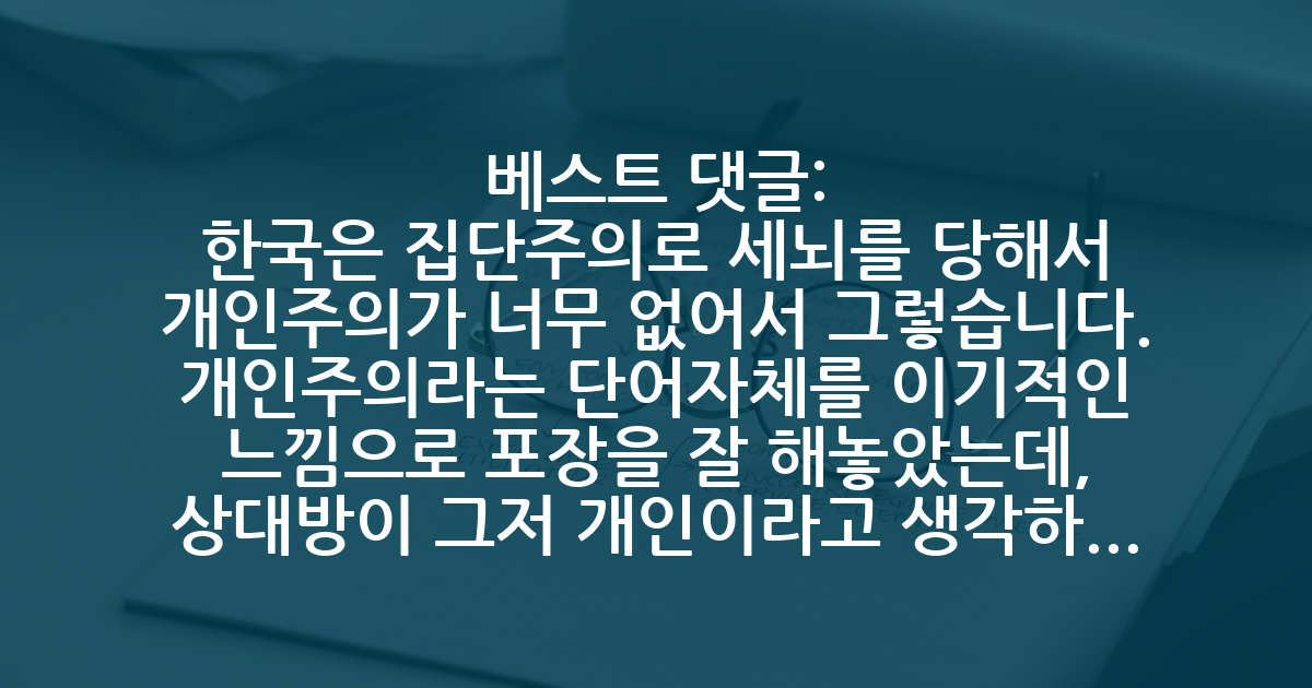 BEST한국은 집단주의로 세뇌를 당해서 개인주의가 너무 없어서 그렇습니다. 개인주의라는 단어자체를 이기적인 느낌으로 포장을 잘 해놓았는데, 상대방이 그저 개인이라고 생각하면 모든게 이해되고 존중할 수 있습니다. 열심히하면 응원해주고 못하면 도와주고요. 잘되는 사람 욕해봐야 잘되는 사람은 계속 잘 될텐데 뭐하러 입아프게 욕하나요? 욕한다고 평판에 스크래치도 나지 않습니다. 그냥 단체로 전염성이 매우 강한 정신병에 걸린겁니다. 개인주의라는 백신이 필요합니다. 진심