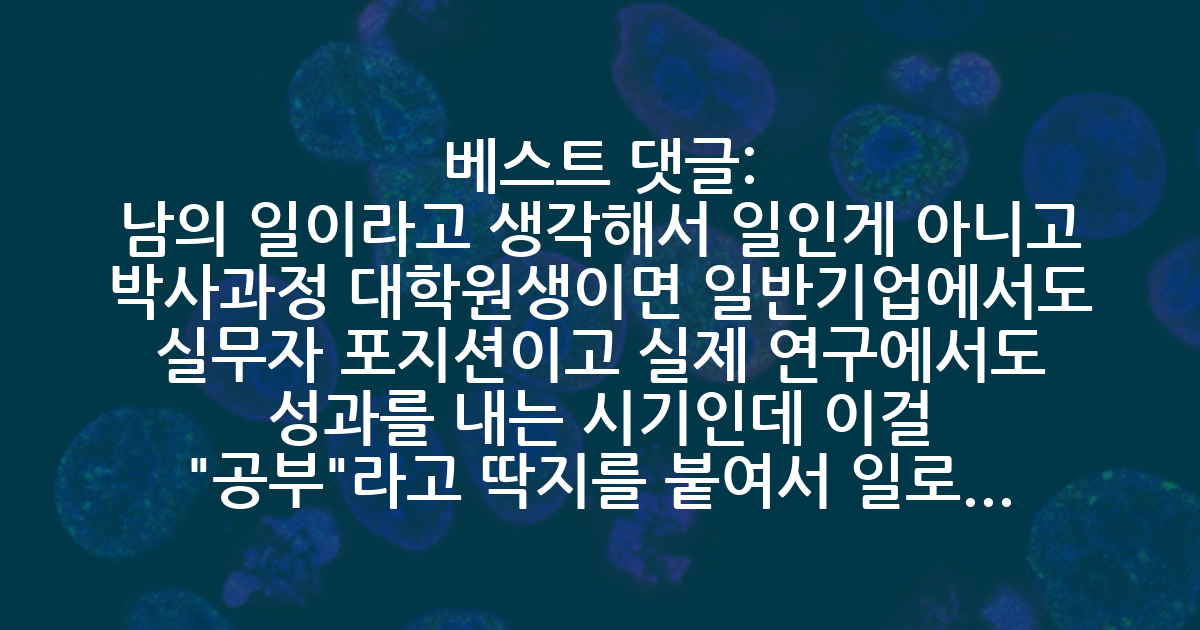 BEST남의 일이라고 생각해서 일인게 아니고 박사과정 대학원생이면 일반기업에서도 실무자 포지션이고 실제 연구에서도 성과를 내는 시기인데 이걸 "공부"라고 딱지를 붙여서 일로 취급을 안 하니까 "학생"이라느니 "네가 하고 싶은 연구"라느니 하는 것들을 붙여서 저임금 초과노동을 강요하는 일이 생기는 거죠. 연구가 취미활동인가요? 엄연히 일하는 것이고 그에 맞게 대우해야 합니다.