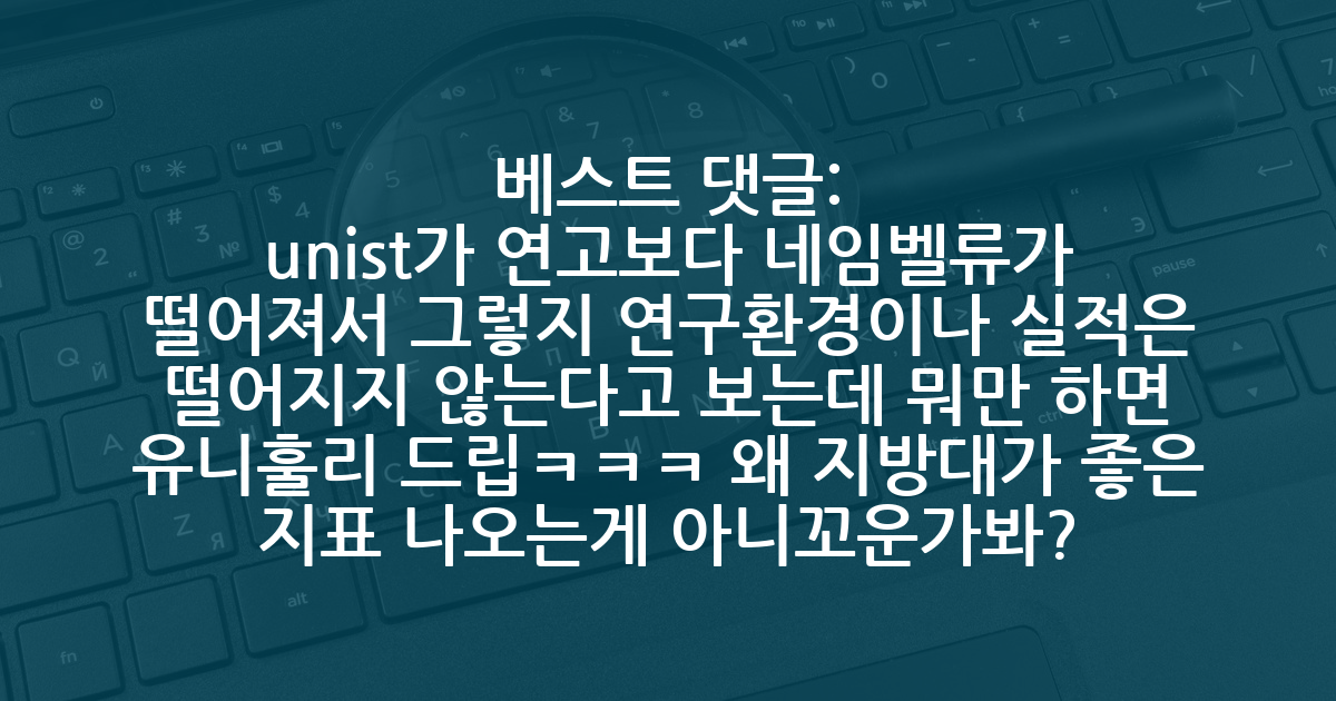 unist가 연고보다 네임벨류가 떨어져서 그렇지 연구환경이나 실적은 떨어지지 않는다고 보는데 뭐만 하면 유니훌리 드립ㅋㅋㅋ 왜 지방대가 좋은 지표 나오는게 아니꼬운가봐?