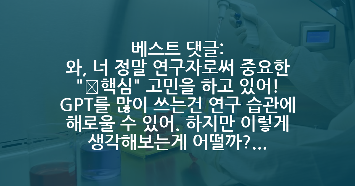 GPT를 많이 쓰는건 연구 습관에 해로울 수 있어. 하지만 이렇게 생각해보는게 어떨까? 🍀 GPT는 너의 작업을 도와주는 Co-worker(협력자) 역할일 뿐이야! 🍀 GPT는 네가 못하는 일을 해주는게 아니라, "시간이 오래 걸리는" 일을 대신 해줄 뿐이야! 🍀 GPT를 안 쓰는 것보다, *어떻게* 쓰느냐가 더 중요할거야!