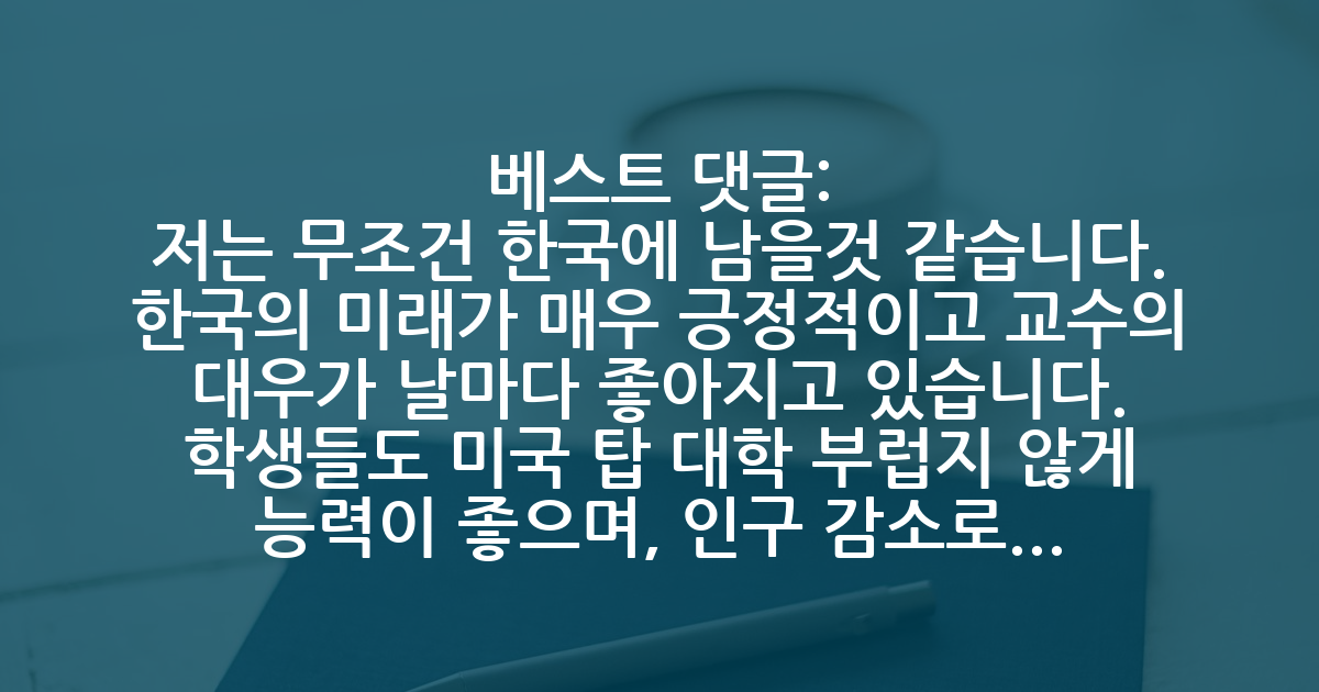 BEST저는 무조건 한국에 남을것 같습니다. 한국의 미래가 매우 긍정적이고 교수의 대우가 날마다 좋아지고 있습니다. 학생들도 미국 탑 대학 부럽지 않게 능력이 좋으며, 인구 감소로 엘리트들만 살아남아서 전반적으로 한국인들의 dna는 우수한 쪽으로 살아남아 있지 않을까 싶습니다. 반면에 미국은 몰락의 길을 걷고 있으며, 예전과 다르게 전세계의 우수 인력을 어트렉트 시키지 못하고 있습니다. 한국에 남아서 최고 수준의 대우와 워라밸을 챙기시길 바랍니다.
