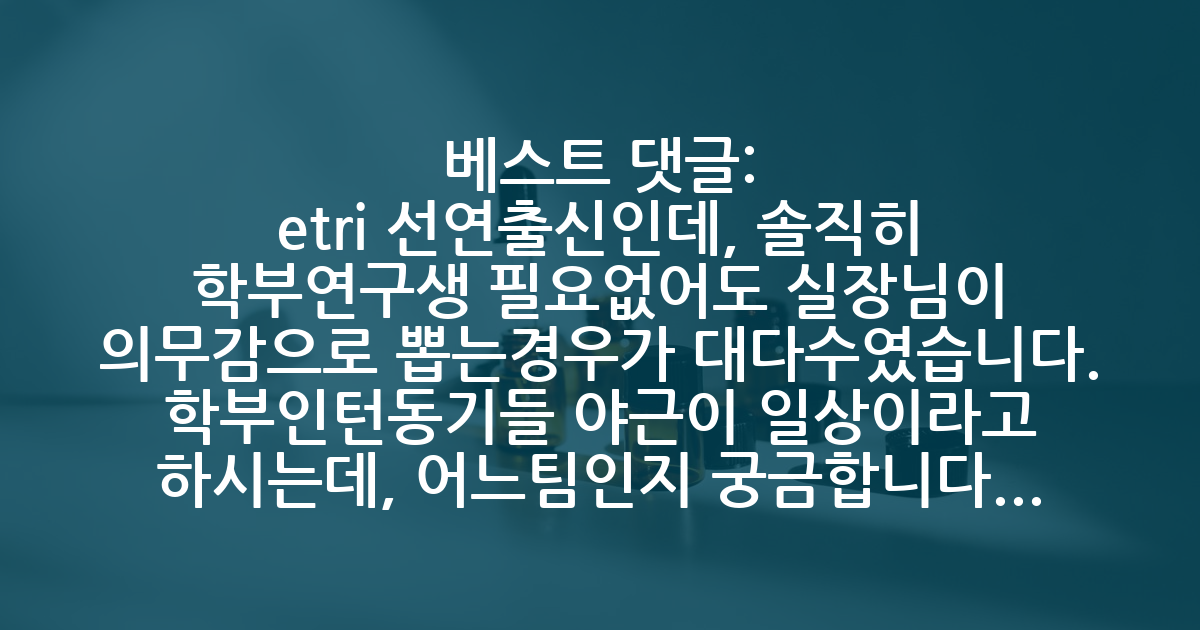 BESTetri 선연출신인데, 솔직히 학부연구생 필요없어도 실장님이 의무감으로 뽑는경우가 대다수였습니다. 학부인턴동기들 야근이 일상이라고 하시는데, 어느팀인지 궁금합니다. 제가 원내에서도 꽤나 유명한 하드워커였고, 당시에는 여자친구(현 와이프)와 떨어져지냈어서 매번 저녁식사하고 9-10시에 퇴근했습니다. 그러다보면 당연스럽게 우리 실뿐 아니라 늦게까지 일하는사람들은 많이들 알게됩니다. 그중 학부연구생이 있는건 정말 한번도 못봤습니다. 에트리가 워낙 규모가 커서 제가 당연히 다 알지는못하고, 분명 실력없는 분들도 많지만 반대로 실력 훌륭한분들도 많이 있습니다. 저도 여러가지 불만족스러워서 나온케이스고 에트리의 여러문제점들을 김박사넷 혹은 하브넷에서도 공유하지만, 이런식으로 일반화 하는 말에는 공감하기가 어렵습니다. 솔직히 학부생들이 전반적인 큰그림 못보시면서 본인의 실력을 유독 높게평가하는 경우일수도 있다고 개인적으로는 생각됩니다 ㅎㅎ 그리고 제가 있던 실을 포함해서 대부분의 인턴들은 솔직히 말해서 하는것없이 그냥 적당히 놀다가 돈벌고 가는경우가 대다수였습니다. 원내에서도 디자인 하는사람이 차라리 도움되지, 학부생들 와봤자 신경만써줘야하고 귀찮다는 평이 정말 많았고요. 본인 주변에 얼마나 열심히하는 사람들이 많았는지 모르고, 얼마나 잘하셨던 학부인턴생들이였는지 모르겠어서 어느 실인지도 궁금하긴 하네요.