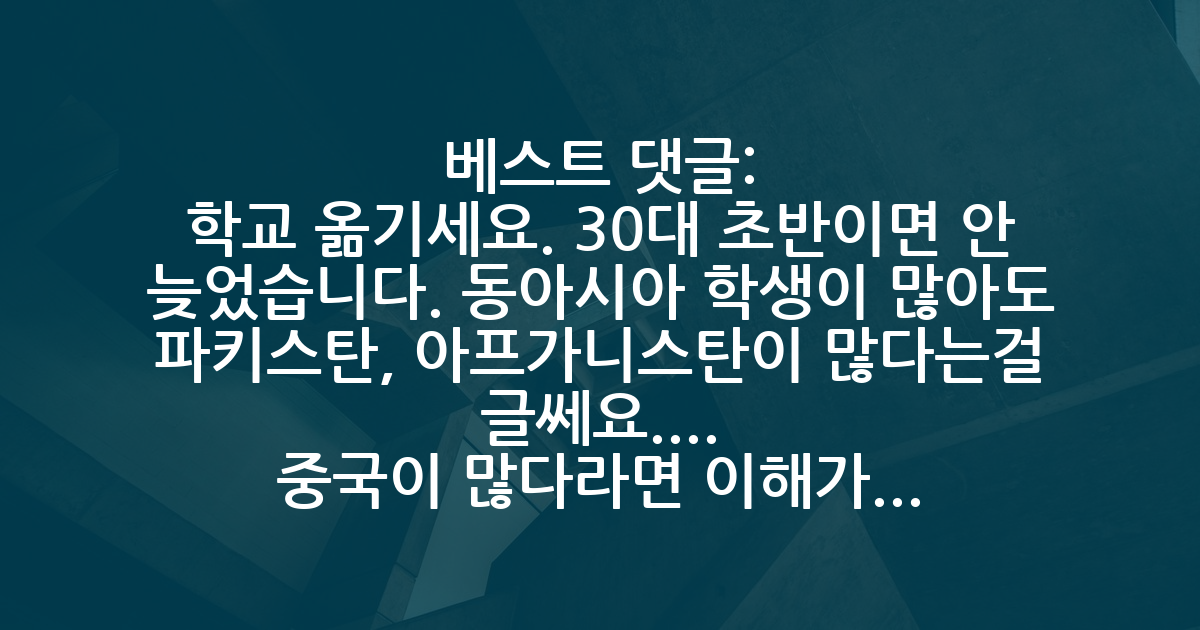 BEST학교 옮기세요. 30대 초반이면 안 늦었습니다. 동아시아 학생이 많아도 파키스탄, 아프가니스탄이 많다는걸 글쎄요.... 중국이 많다라면 이해가 될거같은데... 학교가 그리 높은 수준은 아니라고 생각됩니다. 미국와서 펀딩 이슈로 단 한번도 실험에 제한이 있었던 적이 없는데 의아하네요. visiting도 갈 수 있다는 보장도 없을 뿐더러 결국 제한된 시간에서 해야되는거라 데이터 나올지도 의문이구요.