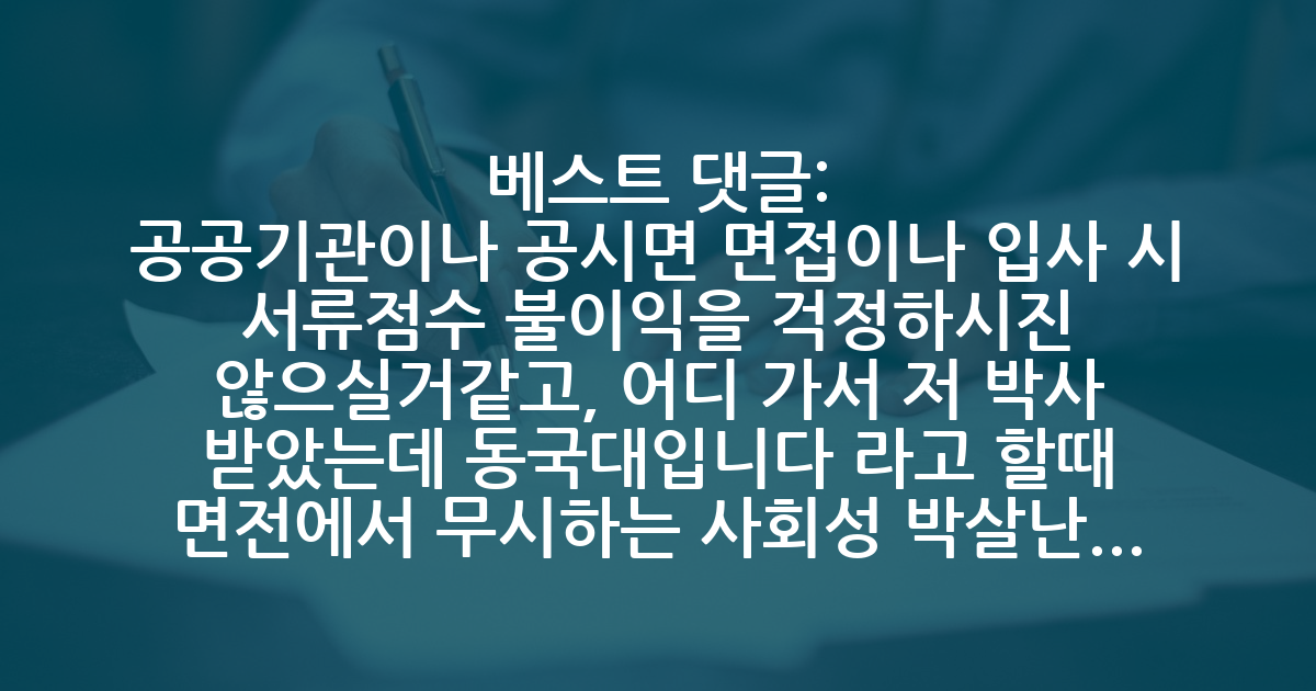 BEST공공기관이나 공시면 면접이나 입사 시 서류점수 불이익을 걱정하시진 않으실거같고, 어디 가서 저 박사 받았는데 동국대입니다 라고 할때 면전에서 무시하는 사회성 박살난 사람들은 그다지 없습니다. 속으로 좀 무시하는 생각을 할 수도 있는데, 사회생활 경험 많고 성숙한 사람들은 학교 간판이야 부질없다는 걸 알기때문에.. 다만 작성자분을 싫어하는 사람이 뒷담화를 할 때 학벌을 가십거리 삼는 정도는 있을지도 모르겠네요. 그리고, 이공계도 졸업 최소 요건만 채우면 졸업 가능합니다. 랩 출근해서 연구활동을 안하면 학위논문 쓰는게 불가능해서 그렇죠. 제가 아는 몇 경제학과나 경영학과 친구들은 비슷한 이유로 연구활동을 하기는 했습니다.