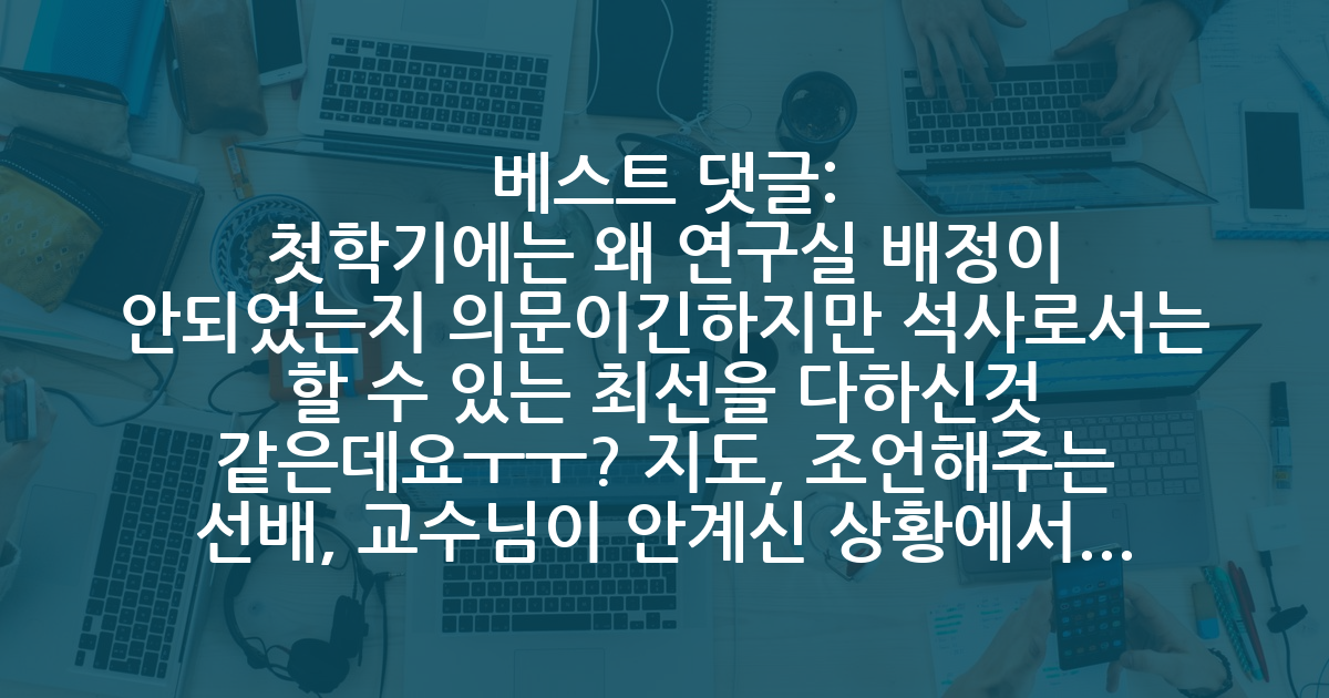BEST첫학기에는 왜 연구실 배정이 안되었는지 의문이긴하지만 석사로서는 할 수 있는 최선을 다하신것 같은데요ㅜㅜ? 지도, 조언해주는 선배, 교수님이 안계신 상황에서 일반적인 석사(아웃라이어 제외)가 뭘 할수있겠어요...